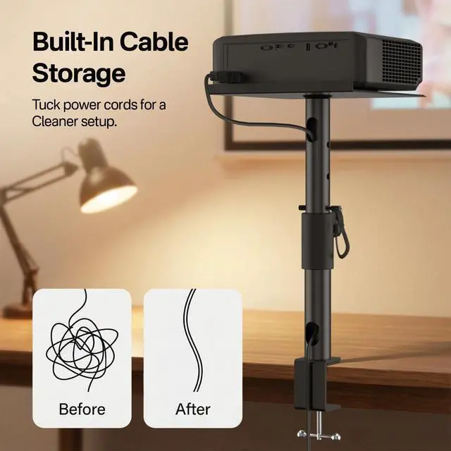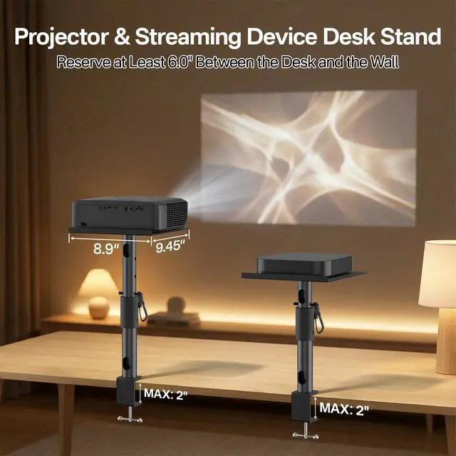 Dual Stand Set for a Complete Setup The desk clamp stands includes two study stands - one for your projector and one for your streaming device, game console or laptop. Create a clean, organized home theater or presentation setup with everything elevated and within reach. ^^ Supports Up to 40 lbs Each - The heavy duty construction desktop clamp stands provides stable support for projectors, media players, gaming consoles, laptops and other home theater or office equipment. Flat tabletop design with a stable base helps keep devices secure during use. Easy to move and reposition, making it ideal for flexible room layouts or temporary setups.