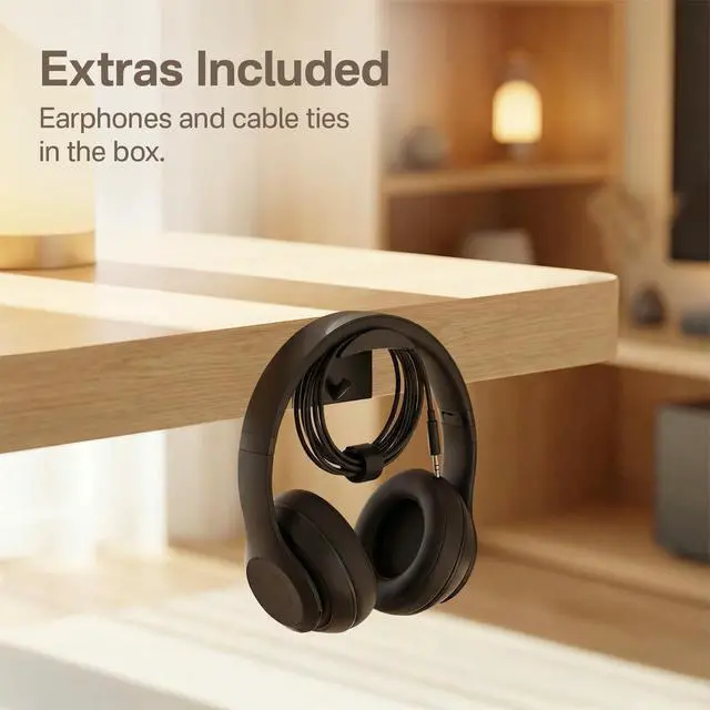 Keep your home theater or entertainment center tidy, with all media devices conveniently elevated and within reach. ^^ Extras for Tidy Workspace Tired of messy cords and a cluttered desk? The streaming desk stand includes additional cable ties and a convenient headphone holder. The cable ties help organize and secure loose wires, while the sleek headphone holder keeps your headphones accessible and neatly stored, freeing up desk space and preventing damage. Transform your chaotic desktop into a clean, organized setup with these thoughtful extras. ^^ Save Space & Keep Your Setup Organized - Elevates devices off the floor or desk to reduce clutter, improve airflow and keep cables and equipment neatly arranged in one compact setup.