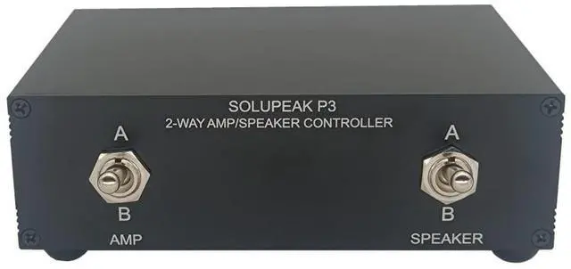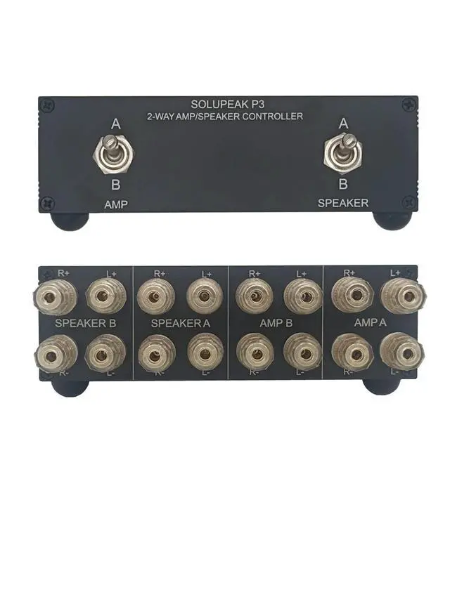 SOLUPEAK P3 is a high quality 2-way AMP&Speaker selector box, it is designed to accept two stereo audio sources such as two amplifiers or receivers to share two pair of loudspeakers, just through the 2 pcs toggle switch in front. You can easy to choose which AMP (A or B) and which pair Speakers (pair A or pair B) to work. This is a good idea to solve the problem of unplugging and plugging the speaker wires.
