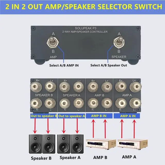 • >P3 is a 2 way amp/speaker switcher. You can choose 2 amplifiers to 2 pair of speakers, Note: 2 pair speaker A and B they don't work at the same time). So you could compare 2 amps or 2 pairs of speakers quickly and conveniently without unplugging and plugging the speaker wires