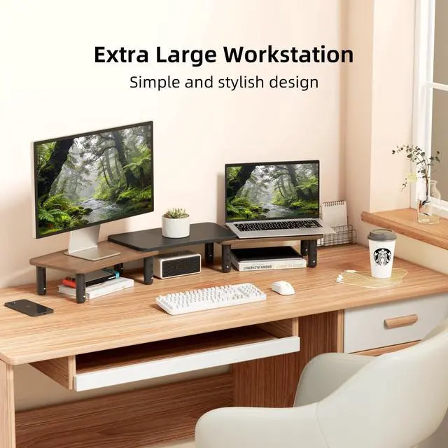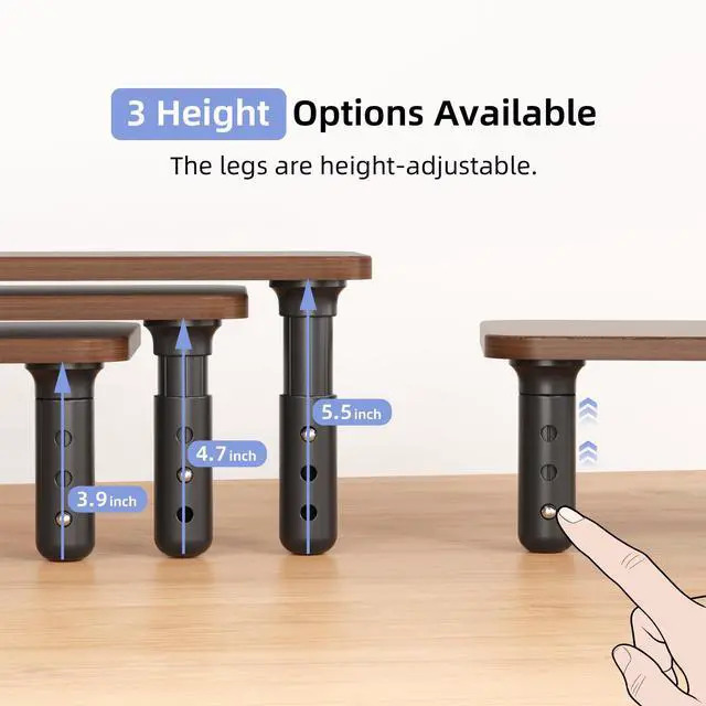 Ergonomic Curved Design Sleek and modern curved structure fits human body engineering, delivering strong visual wrapping sense while blending seamlessly with various home/office decors. The minimalist and elegant appearance elevates your workspace aesthetics, making it both functional and stylish for dual monitors or single large screen use. ^^ 3-Speed Height Adjustment ( 4.9" to 6.5" ) Retractable legs with 3 evenly spaced gears (20mm/ 0.78 in interval each) allow free height switching from 4.9" to 6.5". Customize the height based on your stature and usage habitsno more fixed-height limitations! Maximize under-desk storage space for keyboards, mice, or office supplies, achieving a tidy and space-saving workspace.