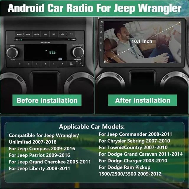 Android Head Unit for Jeep Wrangler+ This 10.1 -inch touch screen radio is designed for Jeep Wrangler & More Models. Ideal for Jeep/ for Dodge owners looking for a modern android car radio upgrade. ^^ Applicable modelsFor Jeep Wrangler/Unlimited 2007-2018, for Jeep Compass 2009-2016, for Jeep Patriot 2009-2016, for Jeep Grand Cherokee 2005-2011, for Jeep Liberty 2008-2011, for Jeep Commander 2008-2011, for Chrysler Sebring 2007-2010, for Town & Country 2007-2010, for Dodge Grand Caravan 2011-2014, for Dodge Charger 2008-2010, and for Dodge Ram Pickup 1500/2500/3500 2009-2012. Always confirm vehicle compatibility before purchasing.