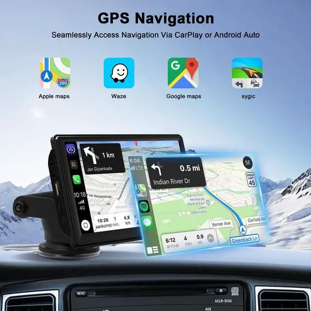 [ Plug & Play CarPlay Screen for Cars ] Compatible with most vehicle models. Designed for effortless installation on the dashboard or windscreen, featuring a rotatable adjustable bracket. Plugs directly into the vehicle's cigarette lighter socket without requiring removal of the console. ^^ [ Wireless Carplay & Android Auto ] Supports CarPlay and Android Auto, connecting your smartphone to automatically access GPS, music, calls and messages on the touchscreen. Use voice control via Siri or Google Assistant, allowing you to keep your focus on the road. ^^ [ 7 HD Touchscreen & Mirror Link ] The portable 7-inch HD touchscreen delivers crisp visuals.