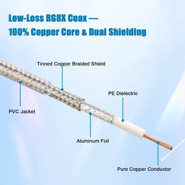 Low-Loss RG8X Coax Cable Built with a pure copper conductor and double shielding (braid + foil), this CB coax cable ensures strong signal transmission and minimal signal loss for high-performance RF applications. ^^ Durable Nickel-Plated Connectors Features corrosion-resistant UHF PL-259 and FME connectors for a secure, long-lasting fit, ideal for both indoor and outdoor environments. ^^ Versatile Connection Options Comes with an FME Female to PL-259 Male cable and an additional FME Male to PL-259 Male adapter, offering multiple configurations for your antenna or radio setup. ^^ Flexible & Ready to Use The soft PVC outer jacket makes installation easy, even in tight spaces.