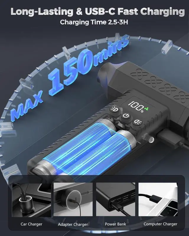 Safety and Longevity Equipped with an 8000mAh lithium battery, the Koilboane electric dust blower offers fast charging and up to 200 minutes of runtime. With built-in over-temperature protection, it provides peace of mind, eliminating concerns about fire risks.