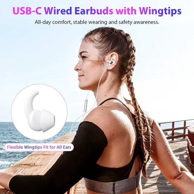 Improved Comfort Design: The running USB-C headphones improved with flexible soft wingtips, increase earbuds comforty and stability whatever workout or just staying sofa; Remember to replace the suitable wingtips for best listening experience ^^