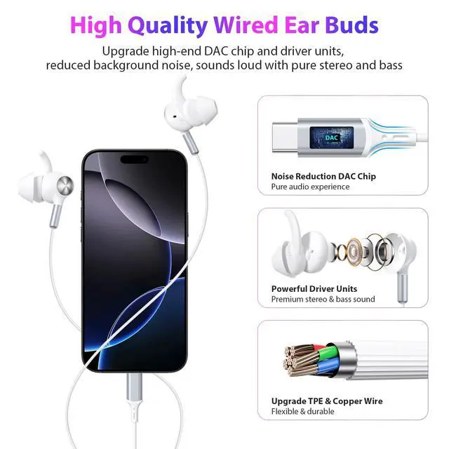 Just Plug & Play: Simply plug these wired earbuds USB-C plug into your phone or other usb c device for excellent listening, low power consumption, no latency and no any app or driver needed (Choose as "Headphones" to work with iPhone 17/16/15 series) ^^