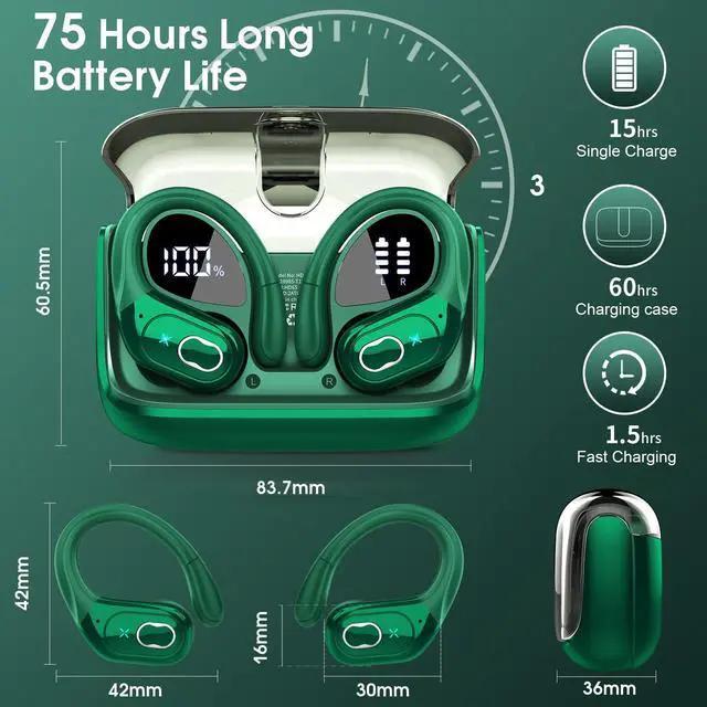 Dual LED Display: Running headphones provides up to 15 hours continuous using time on a single charge, portable charging case can charge the earbuds for 5-6 times, giving 75 hours of a total playtime. Whether on the road or in daily life, it will provide unparalleled convenience and smart experience. The dual LED display on earphones accurately display the remaining power of charging case and the charging progress of Wireless ear buds. ^^ Hi-Fi Deep Bass Stereo and