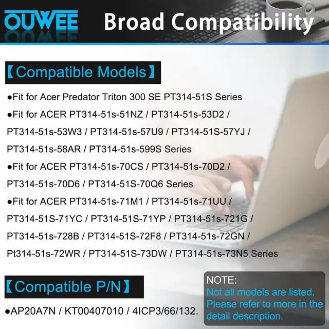 s:, PT314-51s-51NZ, PT314-51s-53D2, PT314-51s-53W3, PT314-51s-57U9,, PT314-51S-57YJ, PT314-51s-58AR, PT314-51s-599S, PT314-51s-70CS, PT314-51s-70D2, PT314-51s-70D6, PT314-51S-70Q6, PT314-51s-71M1, PT314-51s-71UU, PT314-51S-71YC, PT314-51S-71YP, PT314-51s-721G, PT314-51s-728B, PT314-51S-72F8, PT314-51s-72GN, Pt314-51s-72WR, PT314-51S-73DW, PT314-51s-73N5, PT314-51s-74WT, PT314-51S-75JM, PT314-51s-76DC, PT314-51s-76JL, PT314-51s-76QN, PT314-51s-77SS, PT314-51s-78BL, PT314-51s-78LZ, PT314-51s-78T1, PT314-51s-7948, PT314-51s-79FK, PT314-51s-79GH, PT314-51s-79TY. ^^ Safe to UseAll OUWEE products are Certified by UL / CE / FCC / RoHS for safety. Strict guidelines for compatibility, strict quality control standards to ensure the true capacity, stable current and low self-discharge and standards compliance for environment safety. We are confident in the performance of the replacement battery. ^^ OUWEE Perfect After-saleRest assured with 30 days money-back and 12 months Warranty; 24 x 7 email support. Any questions you can contact with us via "Your Orders" tab in account. We are committed to resolving any situation in which our product does not meet your expectations.