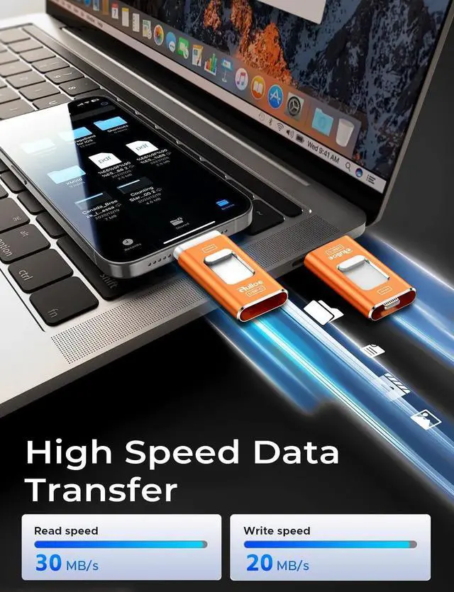 Higher: Simply insert the flash drive into your iPhone iPad, then go to the "Files" app, Click back to Browse and find the flash drive named Untitled, Move photos videos and files to your iPad or iPhone as needed. ^^ How to transfer in Android PhonesAndroid phones need to support OTG, and flash drives can be found in the File Manager of most Android devices. ^^ Kindly NoteThe phone case may prevent the proper connection between a phone and a usb flash drive, which could result in the phone being unable to recognize the usb flash drive. In this situation, please do not conclude that the usb flash drive cannot be used, remove the phone case and try again. ^^ Kindly Note1) For Flash Media Devices, 1 megabyte = 1 million bytes; 1 gigabyte = 1 billion bytes. Actual useable capacity may vary. Some of the listed capacity is used for formatting and other functions, and thus is not available for data storage. 2) Up to 30MB/s read speed, write speed is lower. Based on internal testing; performance may be lower depending on the host devices and users settings and configurations.