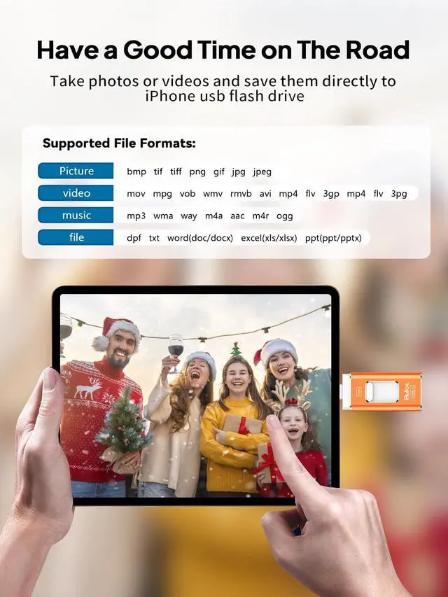 (Note: For iPhone/iPad No App Required; For Android only Needs OTG Enabled, No Extra App. ) ^^ Blazing Fast Transfers AnywhereEquipped with upgraded high-speed chips, this portable phone external storage flash drive lets you transfer massive files in secondsno WiFi, no data cables needed. Save time when sharing photos or moving large video projects, whether youre traveling, working, or creating content. ^^ Universal Compatibility with Dual InterfacesFeaturing USB-C, USB-L, USB ports adapter, this Compatibility iPhone photo storage stick connects seamlessly with iPhone/iPad devices, Android OTG phones, laptops, and tablets. No iCloud fees, no internet requiredjust plug in and move files freely between your phone, computer, and other devices. ^^ Easy to Backup, Enjoy AnywhereEasy to use, plug and play. With just one click, you can quickly back up videos, photos, contacts, and documents, eliminating tedious copying and pasting. Simply plug in your iPhone, iPad, or Android phone. Files are saved directly to the iPhone storage, freeing up valuable space. You can also share files directly from the photo stick for iphone to social media with one click, instantly sharing moments with friends and family.
