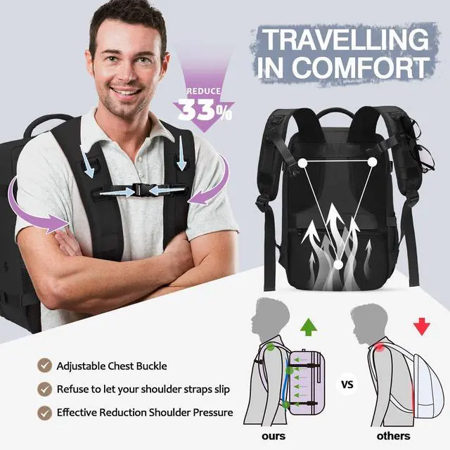 LIGHTWEIGHT & COMFORTABLE DESIGN: Designed for comfort and easy to use. The ergonomic design and padded shoulder straps distribute weight evenly, reducing strain on your back and shoulders, making it comfortable to carry even for extended periods. Also, this backpack comes equipped with a sturdy luggage strap that allows you to secure it to your suitcase, freeing up your hands during transit ^^