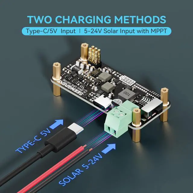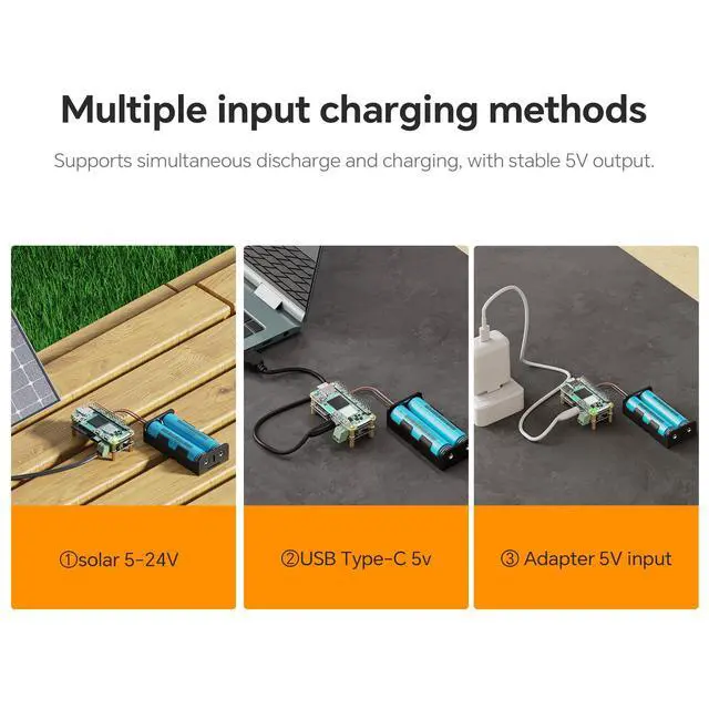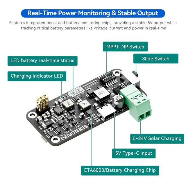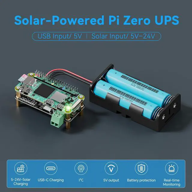 Plug-and-Play CompatibilityFully compatible with the Raspberry Pi Zero seriesno driver installation or configuration required. Just plug in and power up. ^^ True Uninterruptible Power SupplyEquipped with a smart charge management chip supporting path control for seamless switching between charging and dischargingensures stable 5V output without power drops. ^^ Wide-Range Solar Input with MPPTSupports 5V24V photovoltaic input, with onboard MPPT algorithm for intelligent tracking of the maximum power point, maximizing solar charging efficiency. ^^ Onboard Battery Level IndicatorIntegrated LED fuel gauge provides a clear, real-time visual of battery charge status for easier power monitoring.