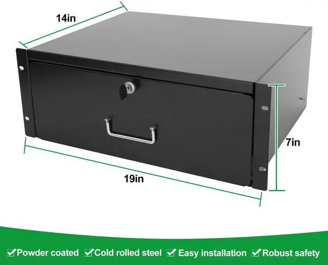 Rack Mount Drawers - Solid, Versatile and Premium Quality, organize and secure your Rack Mount Equipment. This premium quality 4U Drawer, fit different installation depth of racks and cabinets. It is easy to mount on a 19" standard rack or cabinet. The rack drawer is made of cold rolled steel to provide you with a maximum load of 50LB. With the heavy duty materiel, it provides you with exceptional stability. This rack drawer provides you with flexibility to slide extend 10". The internal height is 6", Made of high quality cold rolled steel with an electro- static powder coated finish.