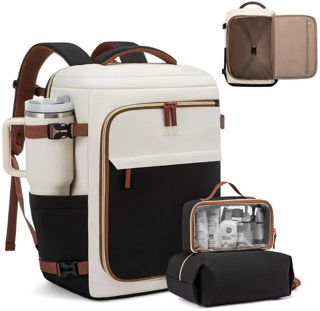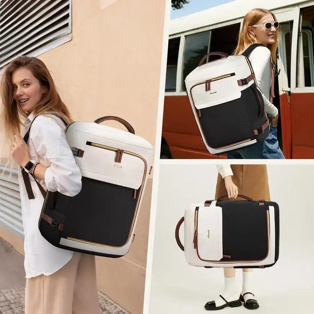 [(Spacious and Organized)] The Travel Backpack for Women features a large capacity with three main compartments, nine internal pockets, and side pockets, including dedicated laptop and tablet sleeves that accommodate up to a 18-inch laptop and a 12.9-inch tablet, ensuring all your travel essentials are easily organized.