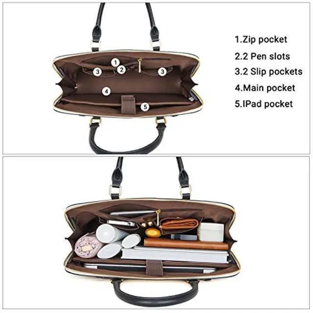 • Large Capacity Design: The main compartments of this laptop bag include 1 main pocket, 1 slip pocket, 2 pen pockets, and 2 inner zip pockets, 1 rear zip pocket, and a computer pocket, a padded compartment keeps your 15.6-inch laptop safe, and dedicated pockets and slots for wallets, pens, mobile phones, and a rear zip pocket can store your valuables and keep your things neat and organized