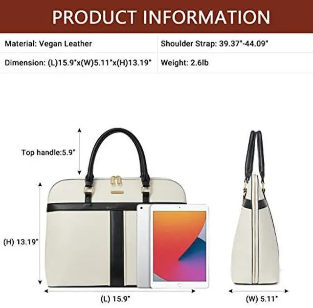 • Dimensions: (L)15.9" x (W)5.11" x (H)13.19" inch. The handle drop is 5.9 inches. Net weight is 2.86 lb. The shoulder bag fits perfectly in a 15.6-inch laptop. You will have extra room for other business office essentials like mobile phones, credit cards, light scarf, books, and makeup