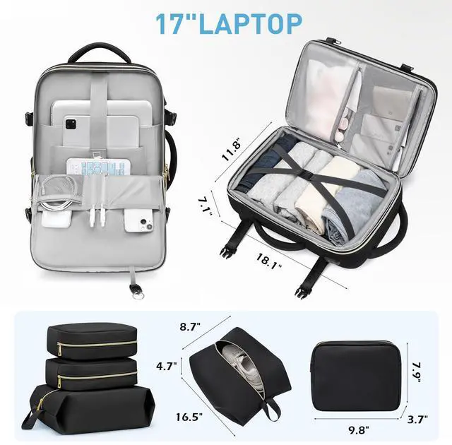 • 3 Extra Packing Cubes: Equipped with 2* storage bags & 1* shoe bag. There is a wet pocket at the top of the large compartment, and you do not worry making your backpack wet