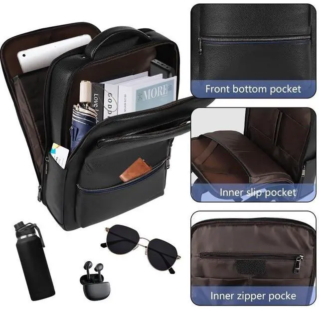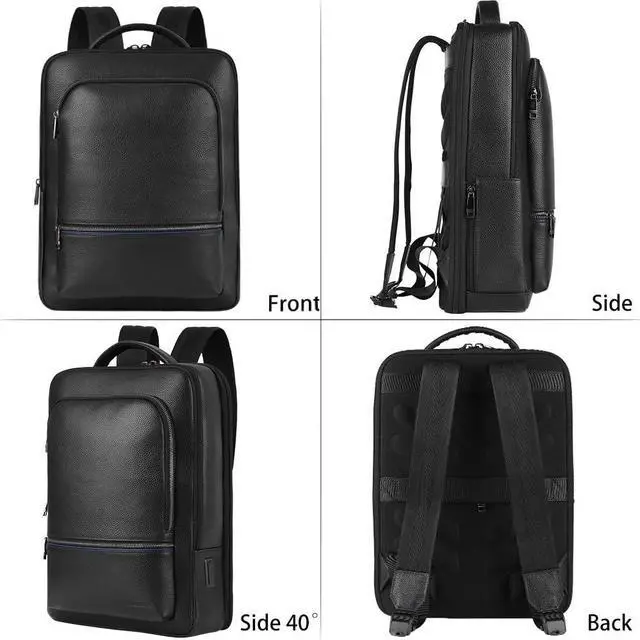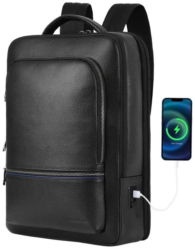 Wesccimo Full Grain Genuine Leather Backpack for Men Multi-Functional 15.6" Laptop Backpack with USB Charging, Black Business Travel Backpack Work Rucksack Daypack
