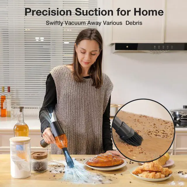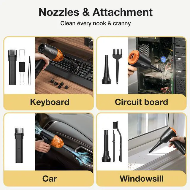 4in1 design: the vacuum cleaner is equipped with 6blowing/suction accessories. Suitable for cleaning computers, keyboards, cars, windows. The inflatable nozzle can be used to inflate swimming rings. The vacuum sealer can extract air from the storage bag