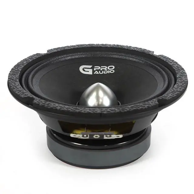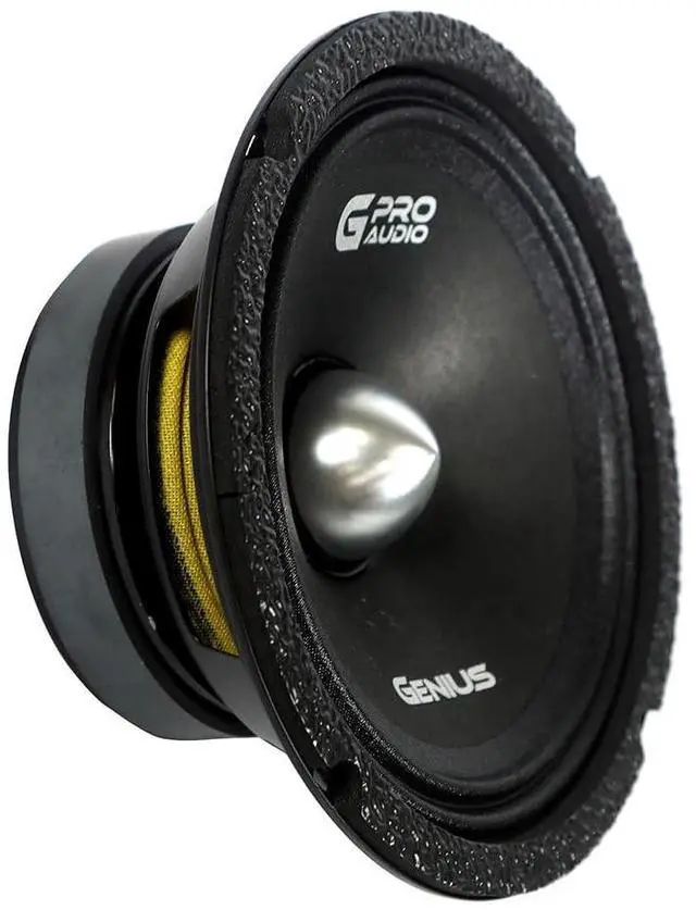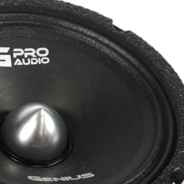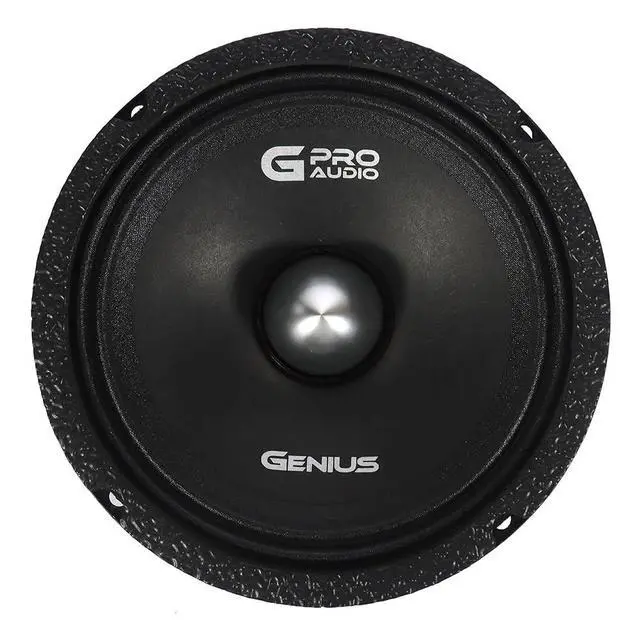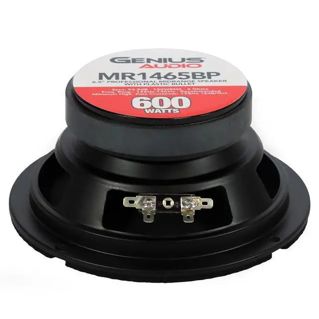 The Genius Audio MR1465BP is a powerful 6.5 professional midrange speaker with a high-efficiency motor and bullet phase plug, designed to deliver accurate and punchy mids in both everyday and competition-grade sound systems. With 150W RMS and 600W peak power handling per speaker, this model blends strength, clarity, and durability. Featuring a lightweight paper cone, cloth surround, and a plastic/aluminum bullet for improved sound dispersion, its built to handle dynamic midrange frequencies with precision. The steel basket, ferrite Y30 magnet, and CCAW voice coil wrapped on a Kapton former ensure high SPL performance and long-lasting reliability, all in a sleek black finish.