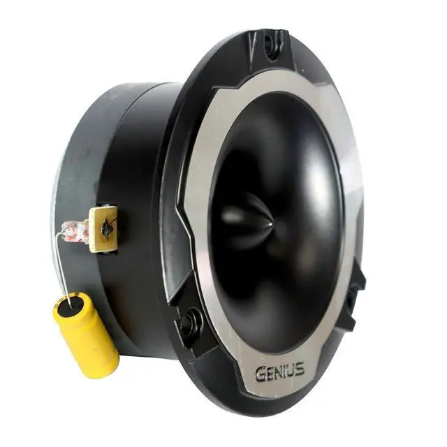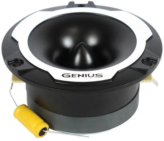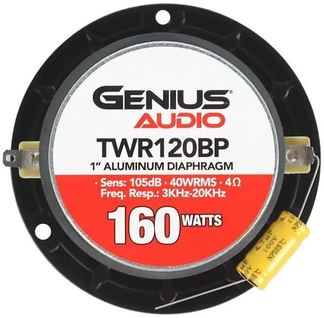 The Genius Audio TWR120BP is a pair of high-compression bullet-style super tweeters built to deliver sharp, powerful high frequencies in compact installations. With a stylish black and silver finish, 3.8" mounting diameter, and a durable aluminum diaphragm, these tweeters are ideal for enhancing detail and brightness in any car audio system. Designed for audio enthusiasts and professionals, the TWR120BP brings crisp definition to vocals, cymbals, and ambient effects without overpowering the mix.