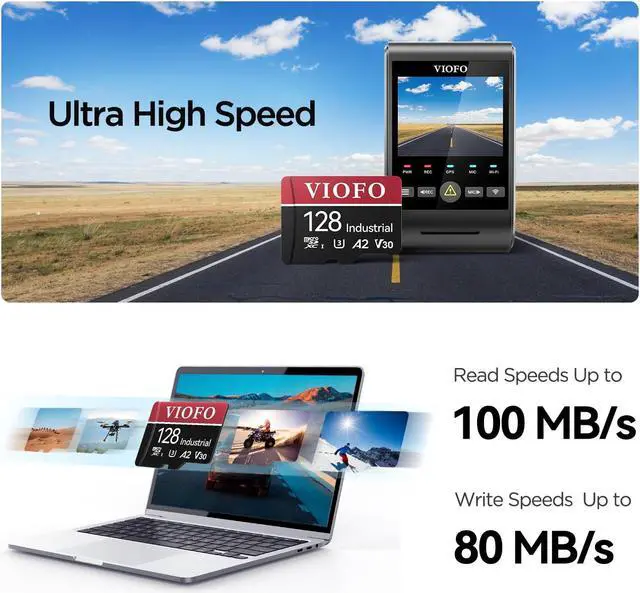 VIOFO 128GB Industrial Grade microSD Card, U3 A2 V30 High Speed Memory Card with Adapter, Support Ultra HD 4K Video Recording