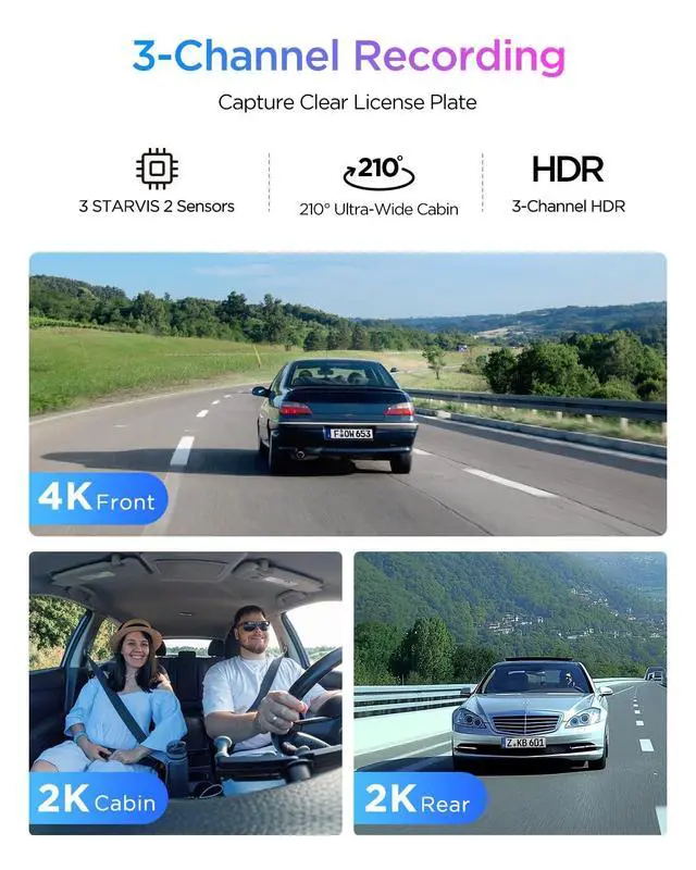 [4K Front + 2K Interior Fisheye + 2K Rear Recording] A329S dashcam captures license plates and road signs in crystal-clear 4K@30fps front footage. Monitor your entire cabin with a 210 ultra-wide angle fisheye lens, eliminating blind spots for rideshares or family safety. Record sharp 2K rear traffic details, capturing license plates and every detail with exceptional clarity day and night. ^^ [3 Channel with STARVIS 2 Sensors] The A329S 3 channel dash cam features 3 STARVIS 2 sensors. The front camera deploys STARVIS 2 IMX678 image sensor that packs in more pixels for greater clarity and detail, achieving less noise in low light and less motion blur in fast motion.