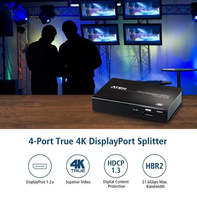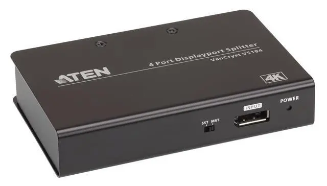 Video Output: 4 x DisplayPort Female (Black) - Video Input: 1 x DisplayPort Female (Black) - Max Distance 4.6m (4096 x 2160 / 3840 x 2160 at 60Hz) with ATEN 2L-7D04DP