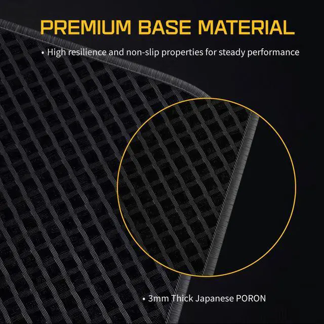 • Premium Japanese PORON Base: 3mm thick base material offering exceptional resilience, consistency in thickness, and superior non-slip properties for steady performance.