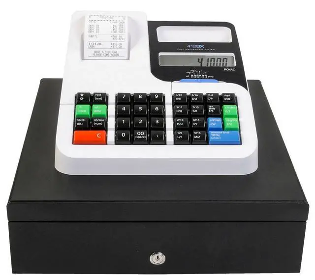 The compact Royal 410DX Cash Management System utilizes a fast and quiet alphanumeric thermal printer. It features a large LCD front display and control switch. It stores up to 2, 000 price lookups.