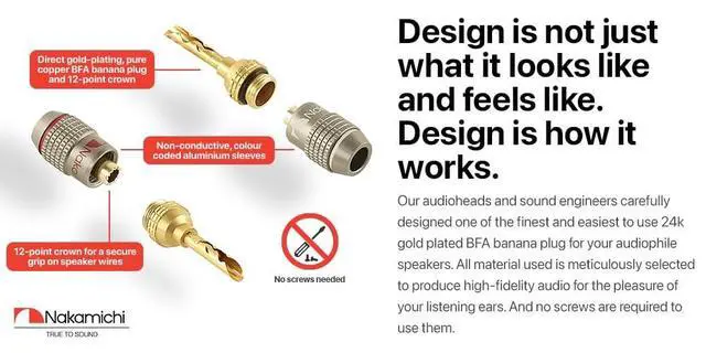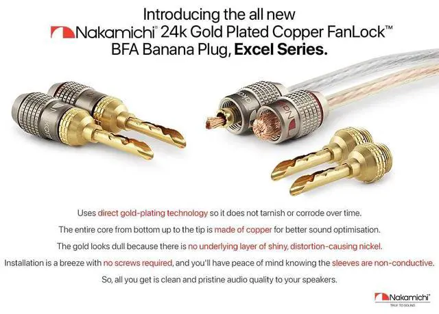 Nakamichi Corporation Ltd. founded in 1948 by Mr. Etsuro Nakamichi, is a Japanese consumer electronics brand that originated in Japan and gained popularity from 1970s onwards from producing high quality audio cassette decks to design-oriented home cinema audio systems, speakers, hi-fi systems, sound bars and automotive stereo products. ^^ Nakamichi FanLock BFA banana plugs fit directly into your audio component binding posts seamlessly, saving you the hassle of screwing in or unscrewing speaker wire especially when space is tight. ^^ This set of FanLock Excel Series - 24k Gold plated BFA banana plug uses direct gold-plating technology so it does not tarnish or corrode over time.