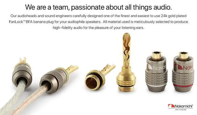 ^^ Nakamichi FanLock Excel Series BFA banana plugs comes with 3-Year warranty and supports 10 AWG - 18 AWG speaker wires. This package comes with 16 Pcs (8-Pairs) of FanLock BFA banana plugs.