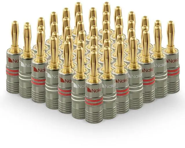 Nakamichi Corporation Ltd. founded in 1948 by Mr. Etsuro Nakamichi, is a Japanese consumer electronics brand that originated in Japan and gained popularity from 1970s onwards from producing high quality audio cassette decks to design-oriented home cinema audio systems, speakers, hi-fi systems, sound bars and automotive stereo products. ^^ Nakamichi banana plugs fit directly into your audio component binding posts seamlessly, saving you the hassle of screwing in or unscrewing speaker wire especially when space is tight. ^^ This set of Ultimate Series - 24k Gold plated beryllium-red copper banana plug uses direct gold-plating technology so it does not tarnish or corrode over time.