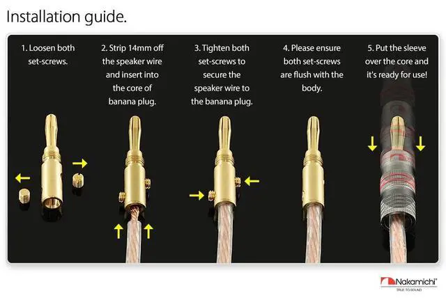 You may secure both set screws to the bare speaker wires for maximum contact or secure one set screw to the speaker wire's PVC jacket for elasticity strength. ^^ Nakamichi Ultimate Series beryllium-red copper banana plugs comes with 3-Year warranty and supports 12 AWG - 18 AWG speaker wires. This package comes with 48 Pcs (24-Pairs) of banana plugs.
