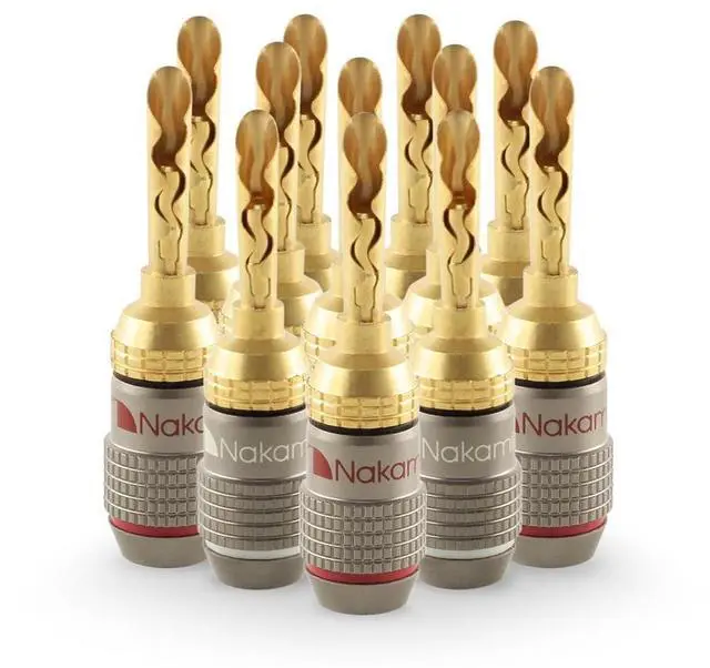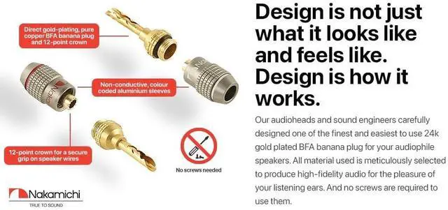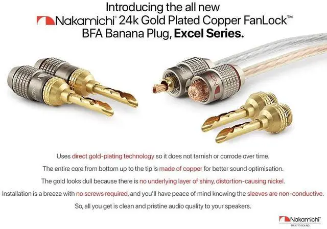Nakamichi Corporation Ltd. founded in 1948 by Mr. Etsuro Nakamichi, is a Japanese consumer electronics brand that originated in Japan and gained popularity from 1970s onwards from producing high quality audio cassette decks to design-oriented home cinema audio systems, speakers, hi-fi systems, sound bars and automotive stereo products. ^^ Nakamichi FanLock BFA banana plugs fit directly into your audio component binding posts seamlessly, saving you the hassle of screwing in or unscrewing speaker wire especially when space is tight. ^^ This set of FanLock Excel Series - 24k Gold plated BFA banana plug uses direct gold-plating technology so it does not tarnish or corrode over time.