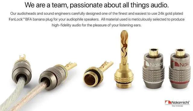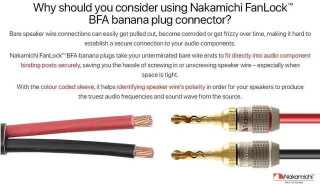 ^^ Nakamichi FanLock Excel Series BFA banana plugs comes with 3-Year warranty and supports 10 AWG - 18 AWG speaker wires. This package comes with 12 Pcs (6-Pairs) of FanLock BFA banana plugs.