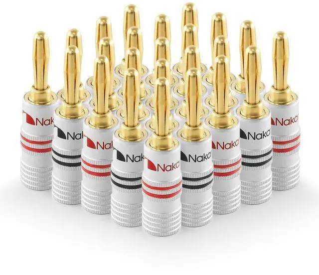 You may secure both set screws to the bare speaker wires for maximum contact or secure one set screw to the speaker wire's PVC jacket for elasticity strength. ^^ Nakamichi Excel Series banana plugs comes with 3-Year warranty and supports 12 AWG - 18 AWG speaker wires. This package comes with 24 Pcs (12-Pairs) of banana plugs.