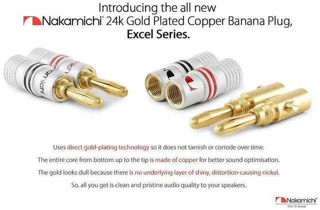 Nakamichi Corporation Ltd. founded in 1948 by Mr. Etsuro Nakamichi, is a Japanese consumer electronics brand that originated in Japan and gained popularity from 1970s onwards from producing high quality audio cassette decks to design-oriented home cinema audio systems, speakers, hi-fi systems, sound bars and automotive stereo products. ^^ Nakamichi banana plugs fit directly into your audio component binding posts seamlessly, saving you the hassle of screwing in or unscrewing speaker wire especially when space is tight. ^^ This set of Excel Series - 24k Gold plated banana plug uses direct gold-plating technology so it does not tarnish or corrode over time.