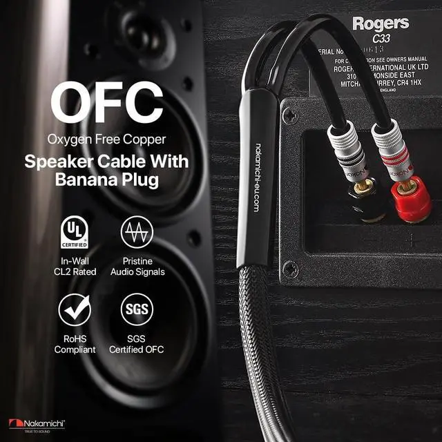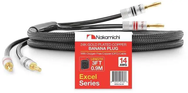 Nakamichi Corporation Ltd. founded in 1948 by Mr. Etsuro Nakamichi, is a Japanese consumer electronics brand that originated in Japan and gained popularity from 1970s onwards from producing high quality audio cassette decks to design-oriented home cinema audio systems, speakers, Hi-Fi systems, sound bars and automotive stereo products. ^^ You can now quickly and effortlessly connect your speaker to an A/V receiver or amplifier equipped with binding posts using the publicly tested and proven Nakamichi Excel Series 24k gold plated copper banana plugs complement with dual-conductor Oxygen Free Copper (OFC) cable. The Nakamichi Excel Series banana plug terminations ensure a secure and reliable connection, offering a convenient alternative to the time-consuming task of cutting and terminating speaker wire.