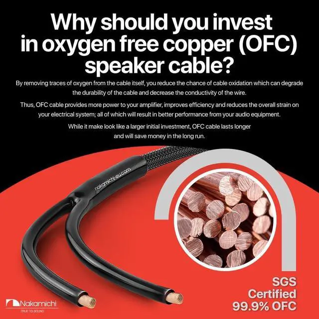 ^^ Why should you invest in OFC cables? By removing traces of oxygen from the cable itself, you reduce the chance of cable oxidation which can degrade the durability of the cable and decrease the conductivity of the wire. Therefore, OFC cable provides more power to your amplifier, improve efficiency and reduce the overall strain on your electrical system; all of which will result in highest audio quality and performance from your audio equipment. While it may look like a larger initial investment, Nakamichi Excel Series banana plugs with OFC cable lasts longer and will save money in the long run.