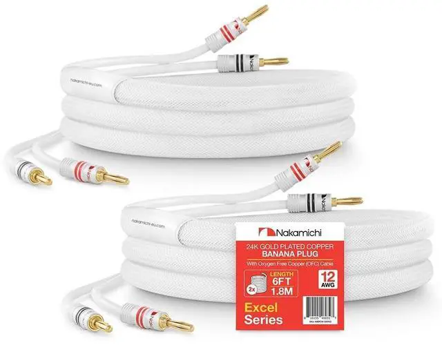 Nakamichi Excel Series 24k Gold Plated Banana Plug with (6 Feet) Speaker Cable Wire 99.9% Oxygen-Free Copper (OFC) Heavy Duty Braided in-Wall CL2 Rated - White (12AWG / 6ft / 1.8m) 2-Pack