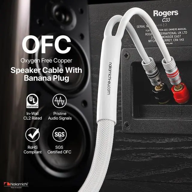 • You can now quickly and effortlessly connect your speaker to an A/V receiver or amplifier equipped with binding posts using the publicly tested and proven Nakamichi Excel Series 24k gold plated copper banana plugs complement with dual-conductor Oxygen Free Copper (OFC) cable. The Nakamichi Excel Series banana plug terminations ensure a secure and reliable connection, offering a convenient alternative to the time-consuming task of cutting and terminating speaker wire.