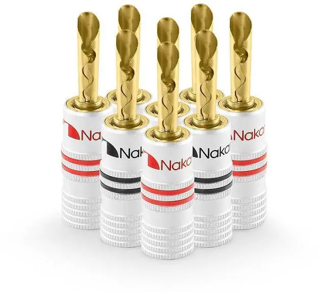 You may secure both set screws to the bare speaker wires for maximum contact or secure one set screw to the speaker wire's PVC jacket for elasticity strength. ^^ Nakamichi Excel Series BFA banana plugs come with 3-Year warranty and support 12 AWG - 18 AWG speaker wires. This package comes with 8 Pcs (4-Pairs) of BFA banana plugs.
