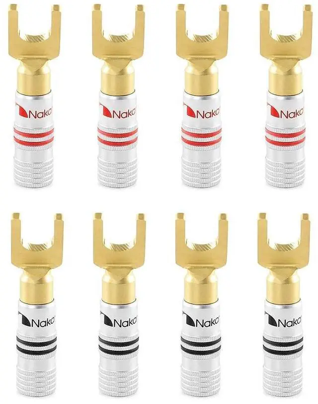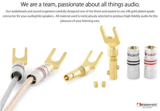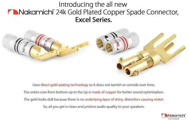 Nakamichi Corporation Ltd. founded in 1948 by Mr. Etsuro Nakamichi, is a Japanese consumer electronics brand that originated in Japan and gained popularity from 1970s onwards from producing high quality audio cassette decks to design-oriented home cinema audio systems, speakers, hi-fi systems, sound bars and automotive stereo products. ^^ Nakamichi spade connectors fit directly into your audio component binding posts seamlessly, saving you the hassle of screwing in or unscrewing speaker wire especially when space is tight. ^^ This set of Excel Series - 24k Gold plated spade connector uses direct gold-plating technology so it does not tarnish or corrode over time.