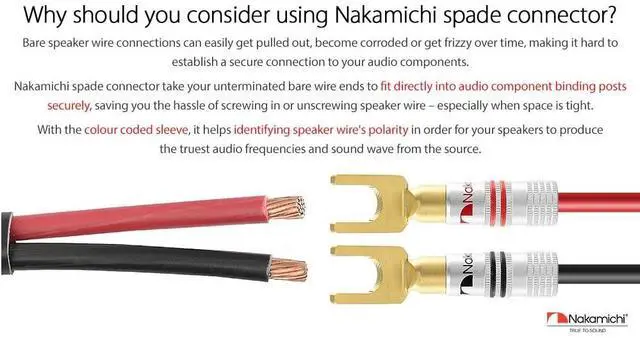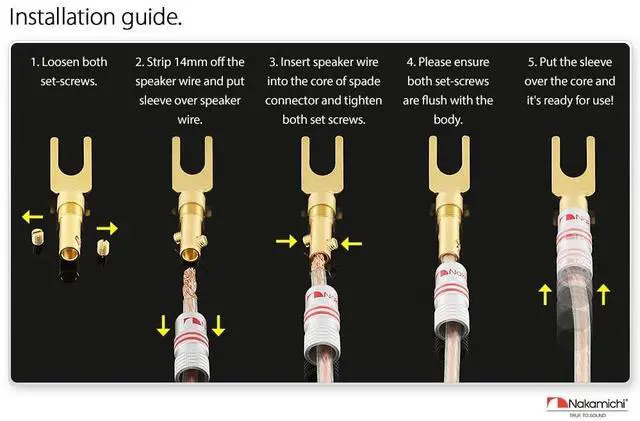 You may secure both set screws to the bare speaker wires for maximum contact or secure one set screw to the speaker wire's PVC jacket for elasticity strength. ^^ Nakamichi Excel Series spade connectors come with 3-Year warranty and support 12 AWG - 18 AWG speaker wires. This package comes with 8 Pcs (4-Pairs) of spade connectors.