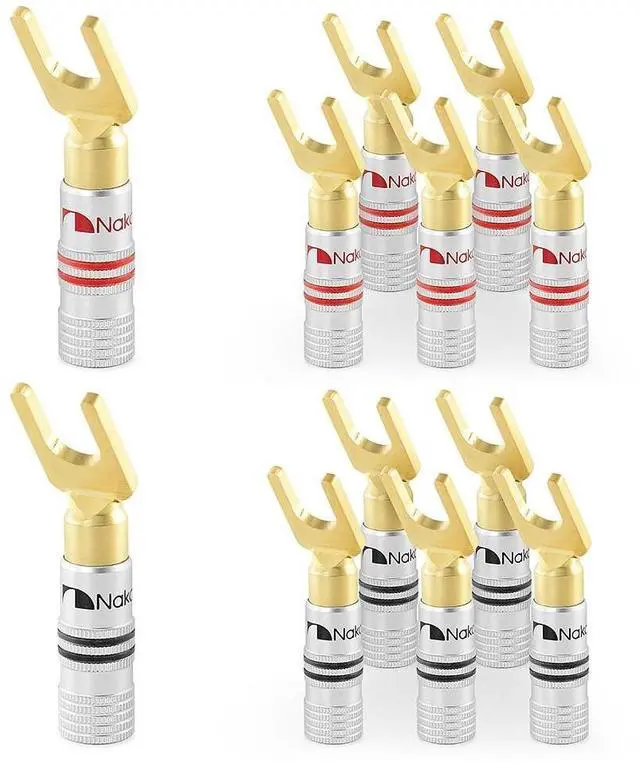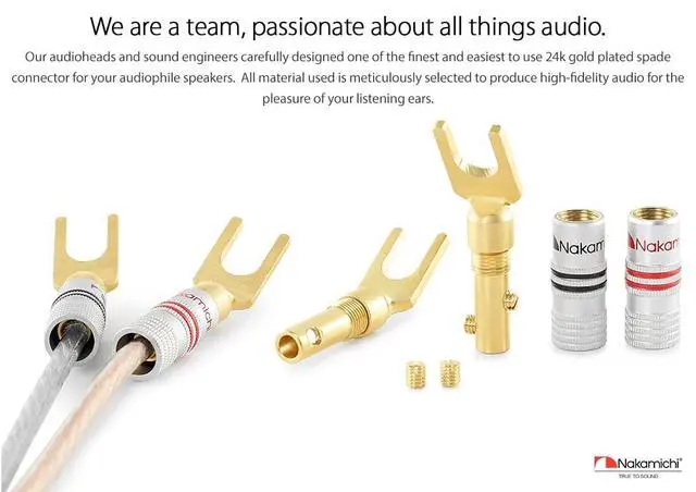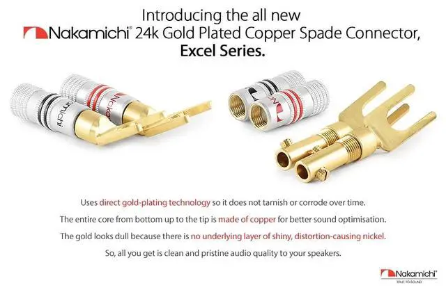 Nakamichi Corporation Ltd. founded in 1948 by Mr. Etsuro Nakamichi, is a Japanese consumer electronics brand that originated in Japan and gained popularity from 1970s onwards from producing high quality audio cassette decks to design-oriented home cinema audio systems, speakers, hi-fi systems, sound bars and automotive stereo products. ^^ Nakamichi spade connectors fit directly into your audio component binding posts seamlessly, saving you the hassle of screwing in or unscrewing speaker wire especially when space is tight. ^^ This set of Excel Series - 24k Gold plated spade connector uses direct gold-plating technology so it does not tarnish or corrode over time.