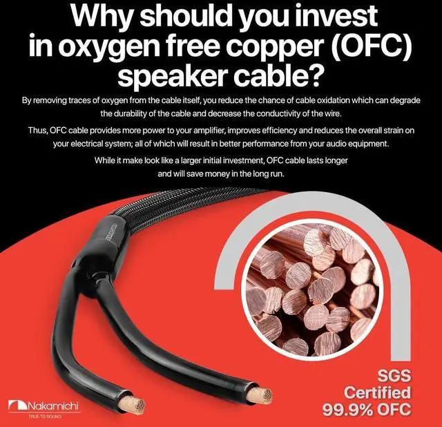 ^^ Why should you invest in OFC cables? By removing traces of oxygen from the cable itself, you reduce the chance of cable oxidation which can degrade the durability of the cable and decrease the conductivity of the wire. Therefore, OFC cable provides more power to your amplifier, improve efficiency and reduce the overall strain on your electrical system; all of which will result in highest audio quality and performance from your audio equipment. While it may look like a larger initial investment, Nakamichi Excel Series banana plugs with OFC cable lasts longer and will save money in the long run.