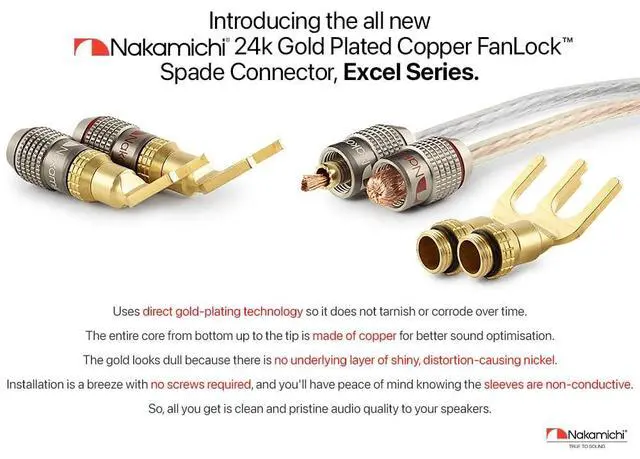 Nakamichi Corporation Ltd. founded in 1948 by Mr. Etsuro Nakamichi, is a Japanese consumer electronics brand that originated in Japan and gained popularity from 1970s onwards from producing high quality audio cassette decks to design-oriented home cinema audio systems, speakers, Hi-Fi systems, sound bars and automotive stereo products. ^^ Nakamichi FanLock spade connectors fit directly into your audio component binding posts seamlessly, saving you the hassle of screwing in or unscrewing speaker wire especially when space is tight. ^^ This set of FanLock Excel Series - 24k Gold plated spade connector uses direct gold-plating technology so it does not tarnish or corrode over time.