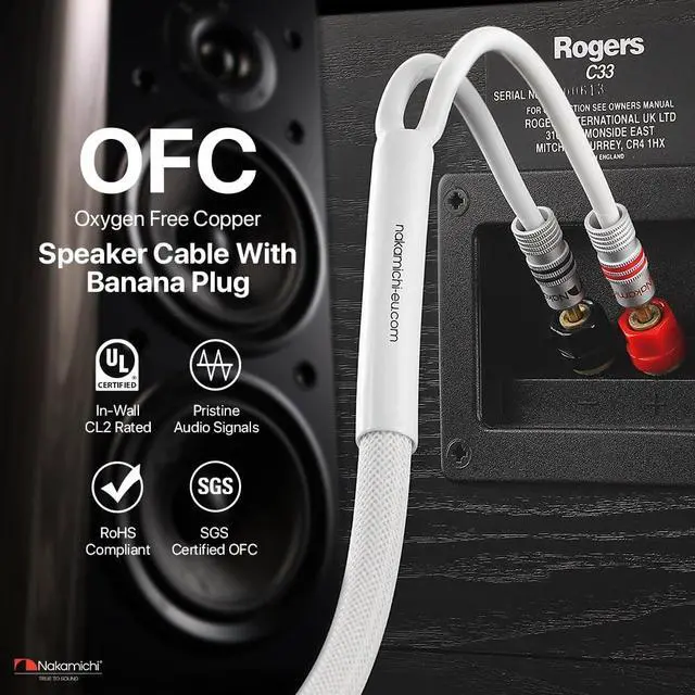 Nakamichi Corporation Ltd. founded in 1948 by Mr. Etsuro Nakamichi, is a Japanese consumer electronics brand that originated in Japan and gained popularity from 1970s onwards from producing high quality audio cassette decks to design-oriented home cinema audio systems, speakers, Hi-Fi systems, sound bars and automotive stereo products. ^^ You can now quickly and effortlessly connect your speaker to an A/V receiver or amplifier equipped with binding posts using the publicly tested and proven Nakamichi Excel Series 24k gold plated copper banana plugs complement with dual-conductor Oxygen Free Copper (OFC) cable. The Nakamichi Excel Series banana plug terminations ensure a secure and reliable connection, offering a convenient alternative to the time-consuming task of cutting and terminating speaker wire.